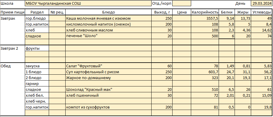 Меню 29 марта