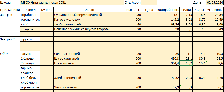 Меню на 2 сентября