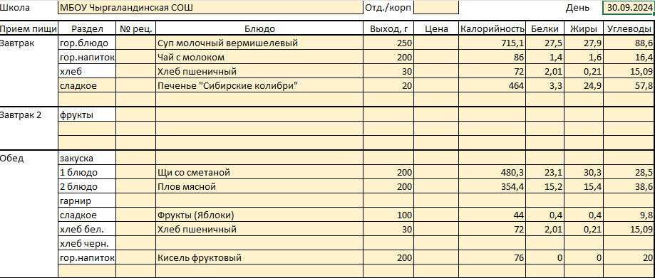 Меню на 30 сентября